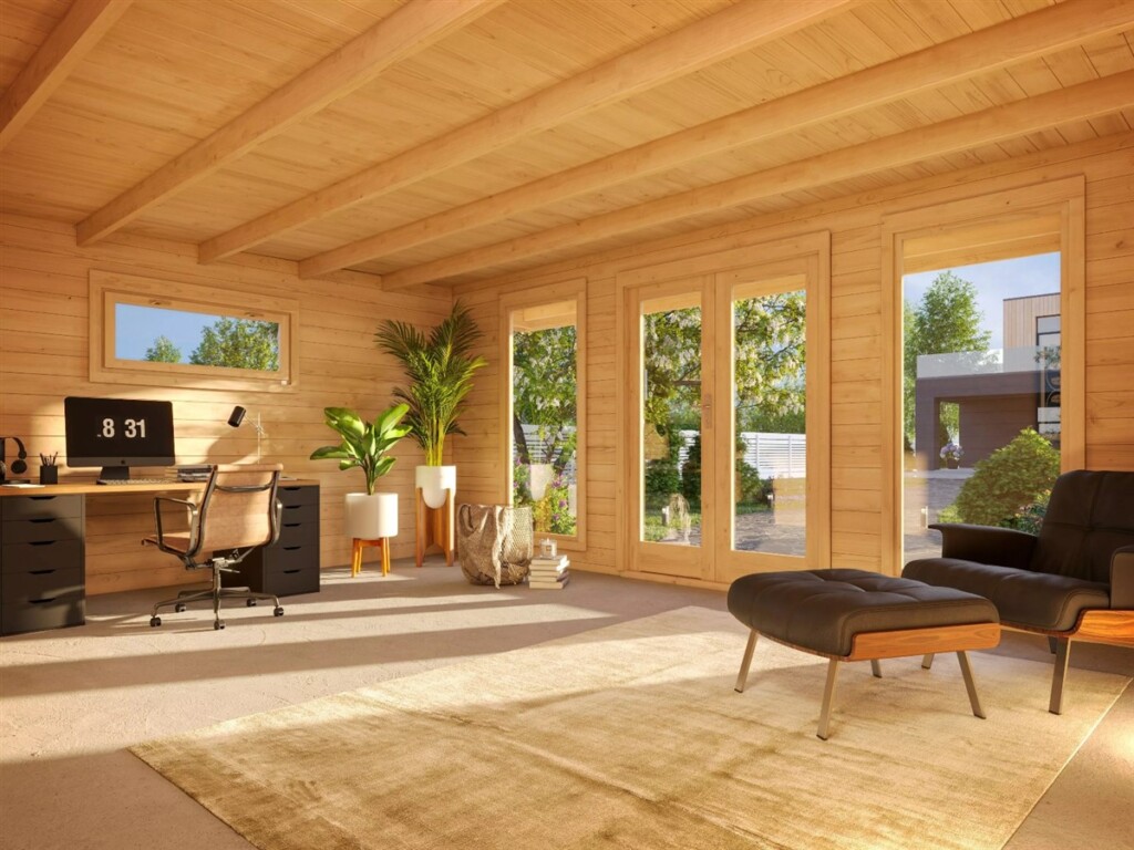 A modern, minimalist garden room with clean lines and a flat-roof design. Crafted from premium Nordic timber and finished with large glazed openings, it creates a bright, refined space that feels effortlessly stylish in any backyard.